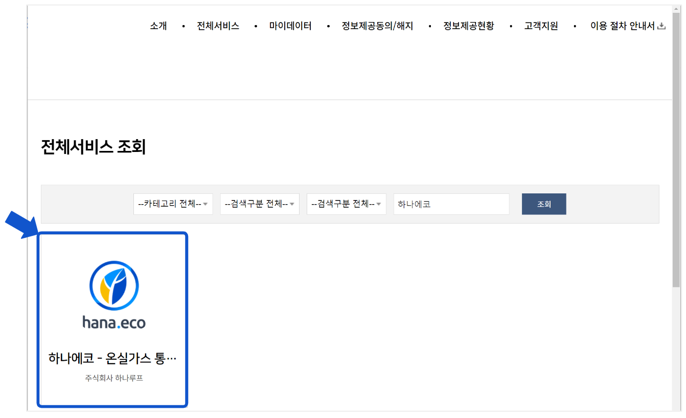 “서비스 검색”창에 "하나에코" 입력하고 “조회”버튼 누름